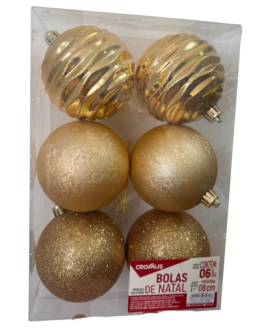 - Apresentação do produto: Sabemos que um dos símbolos natalinos mais são tradicionais em todas as partes do mundo são as árvores de Natal. Sempre presente em diversos ambientes no final do ano, além de decorar, ela simboliza a paz, alegria e esperança. Por isso é importante enfeitá-la com acessórios que a deixarão ainda mais bonita, como as bolas de natal modelo 1207207 da Cromus. São 6 unidades na cor dourada, medindo 8cm de diâmetro. Ideais para embelezar ainda mais a sua casa e deixá-la preparada e pronta à espera dessa época mágica!