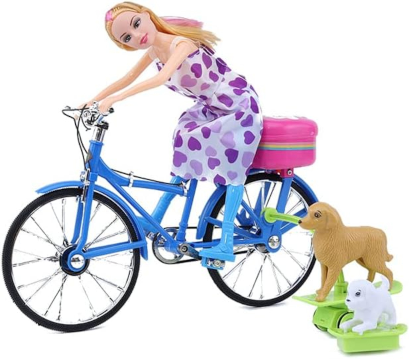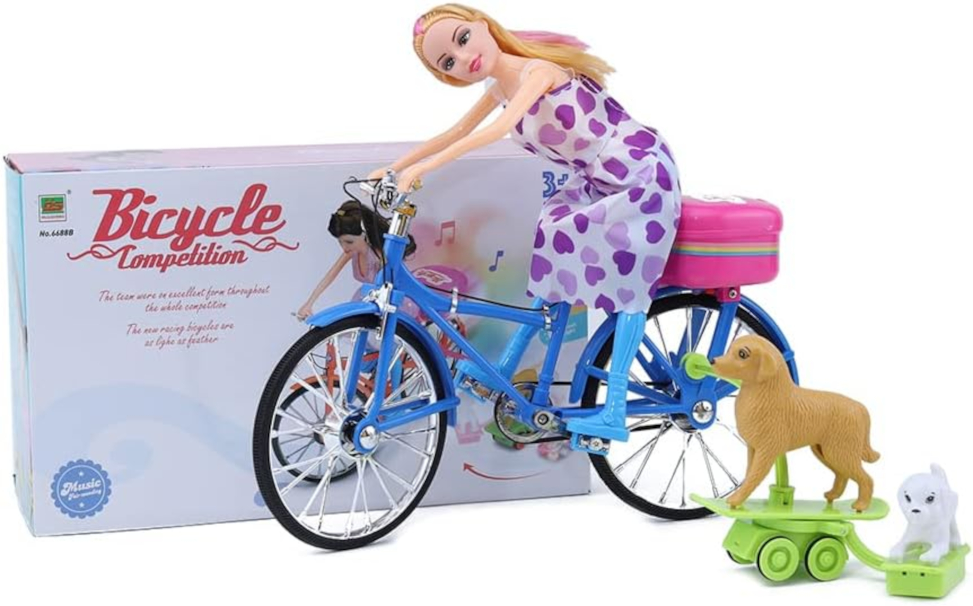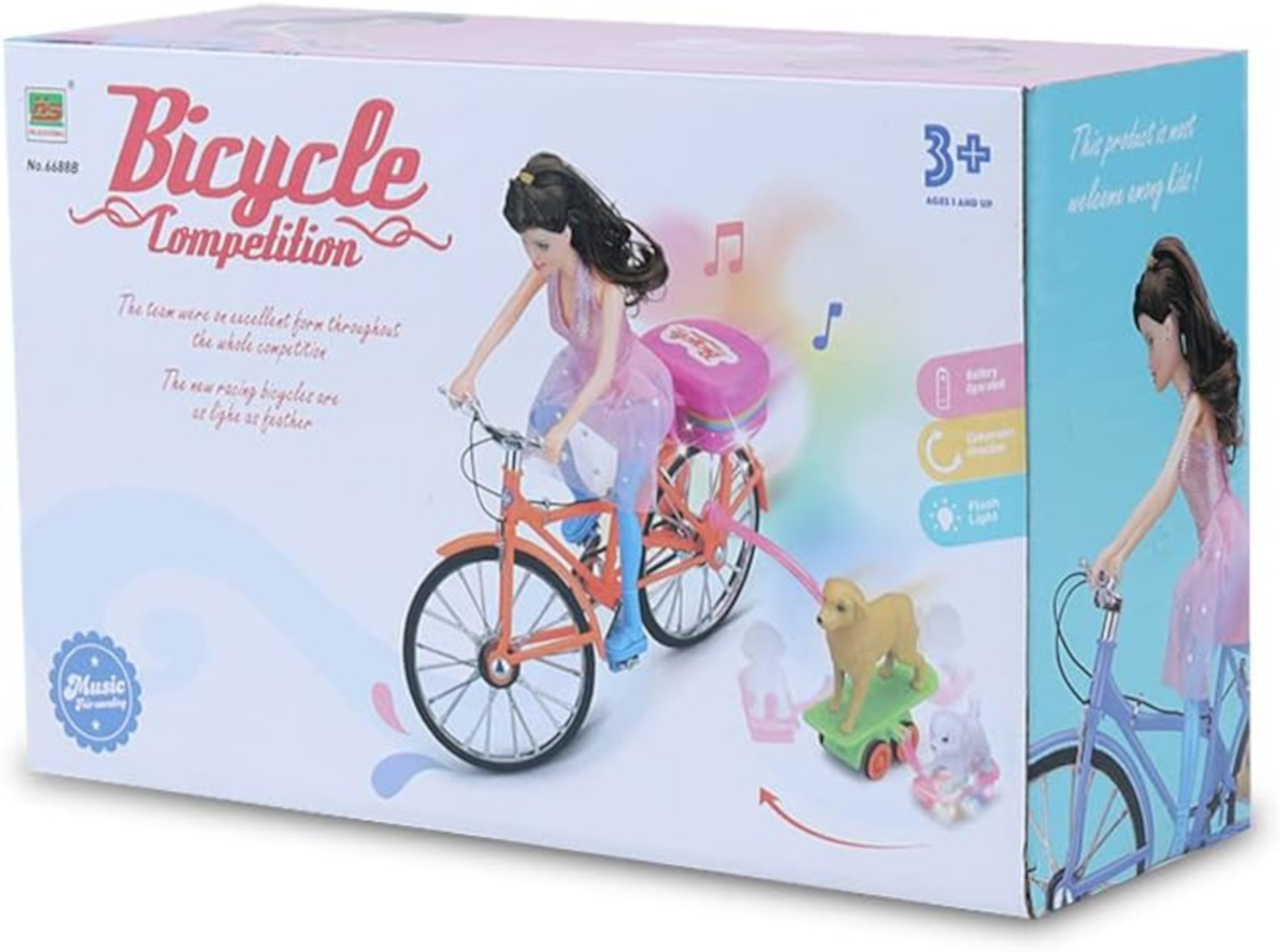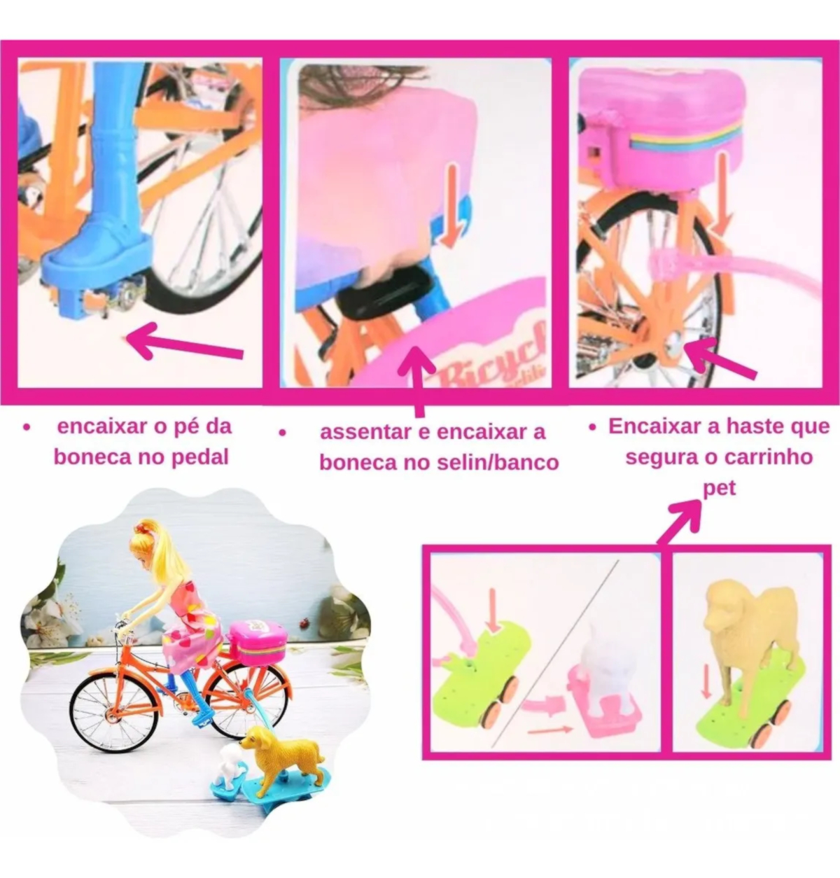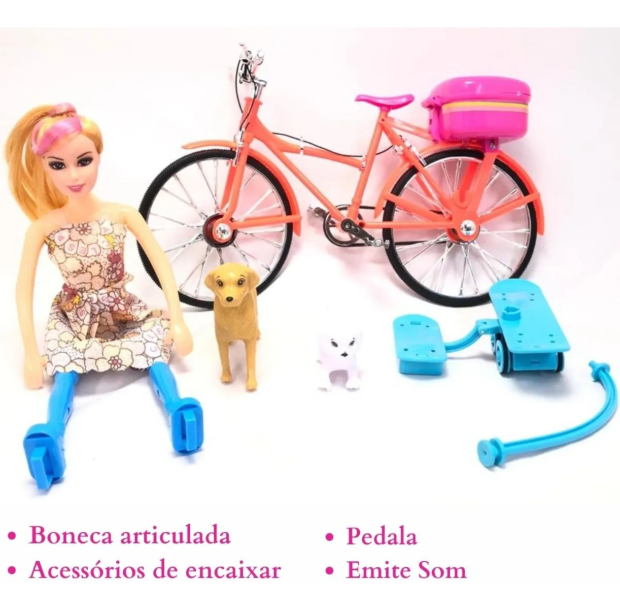 CARACTERÍSTICAS GERAIS: Boneca, com bicicleta, com som, luz e movimento.