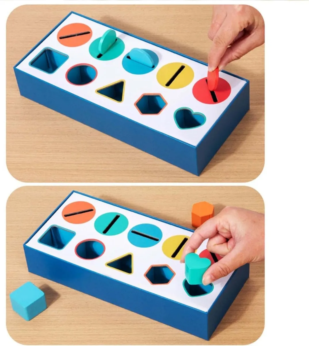 Conteúdo didático: A caixa contém uma variedade de blocos de madeira de diferentes cores e formas, incluindo círculos, quadrados, triângulos, corações, etc. Cada formato tem um correspondente, e as crianças podem aprender a combinar formas colocando blocos de madeira nas tomadas correspondentes.
