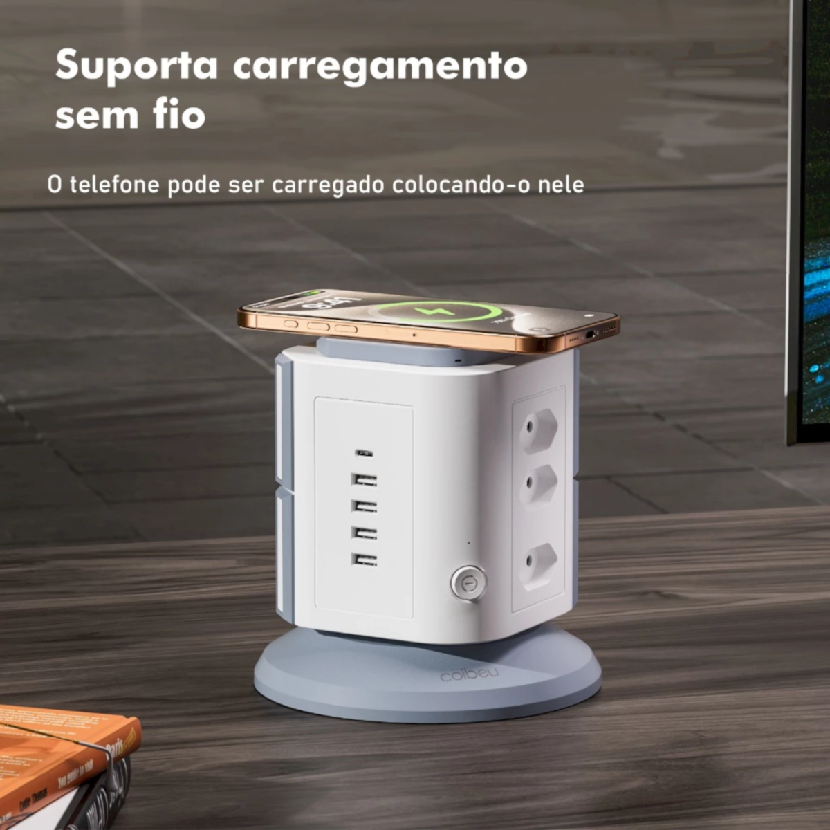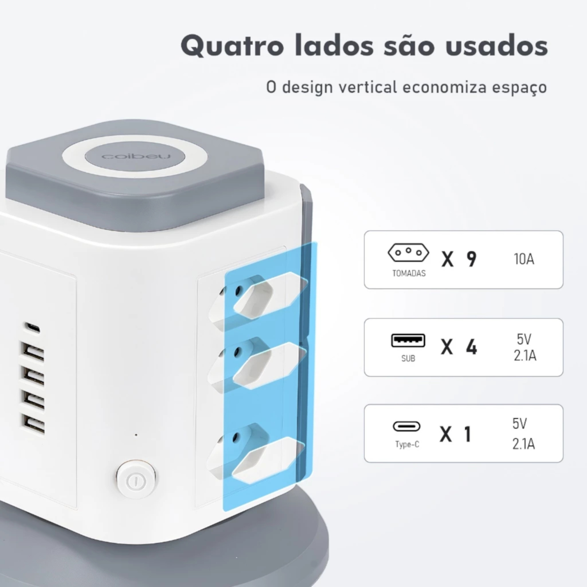 9 tomadas no total (incluindo 4 USB e 1 Type-C), permitindo carregar vários dispositivos simultaneamente.