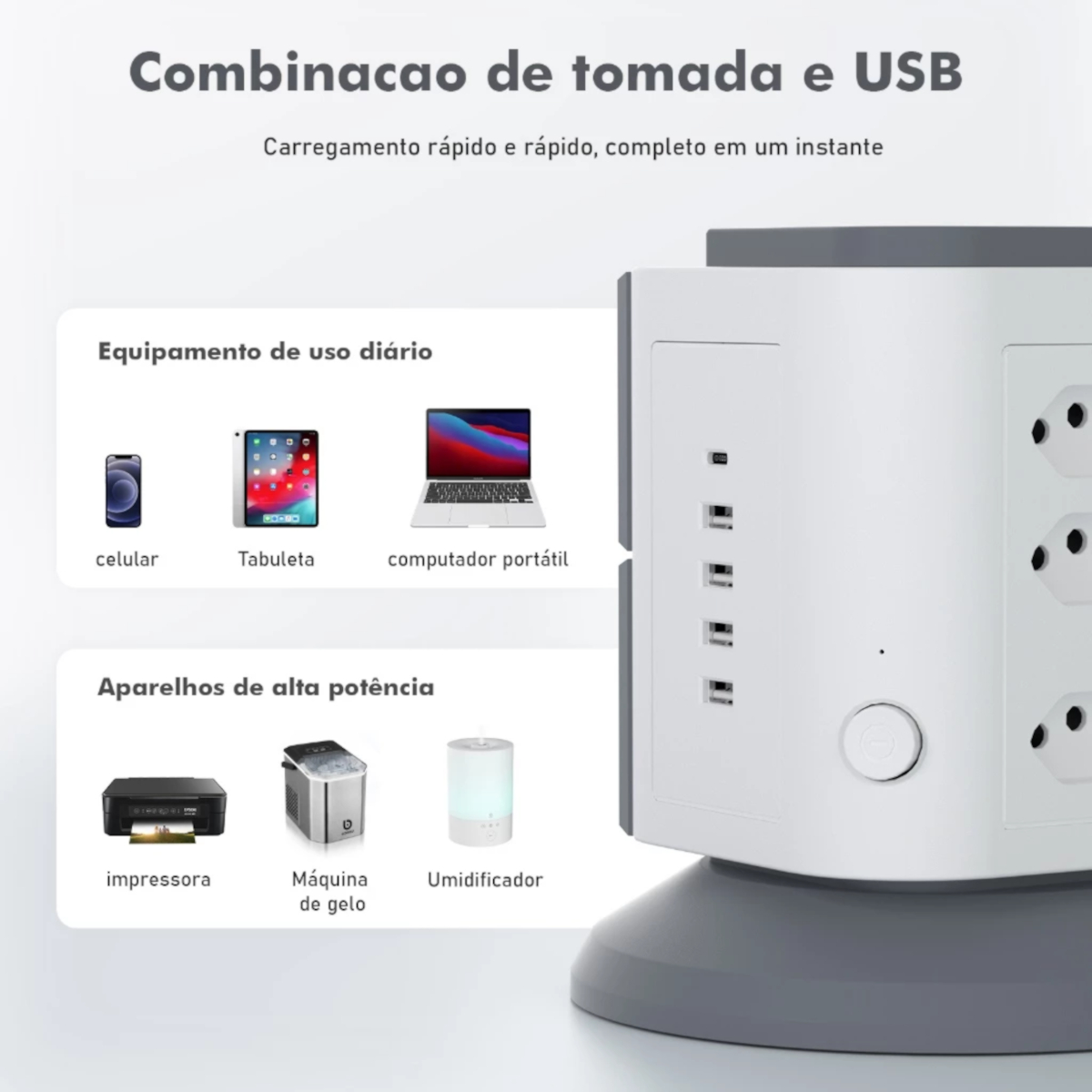 COIBEU Torre de Tomadas Branca 9+4+1 – 9 Tomadas + 4 USB + 1 Type-C Cabo 2m Proteção Contra Sobrecarga