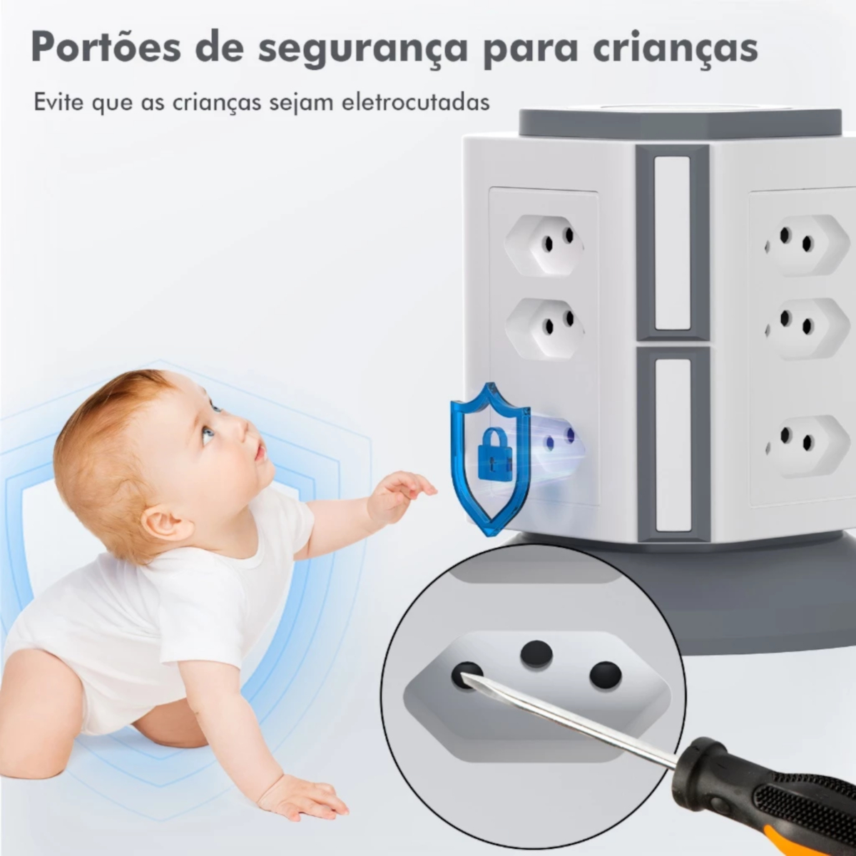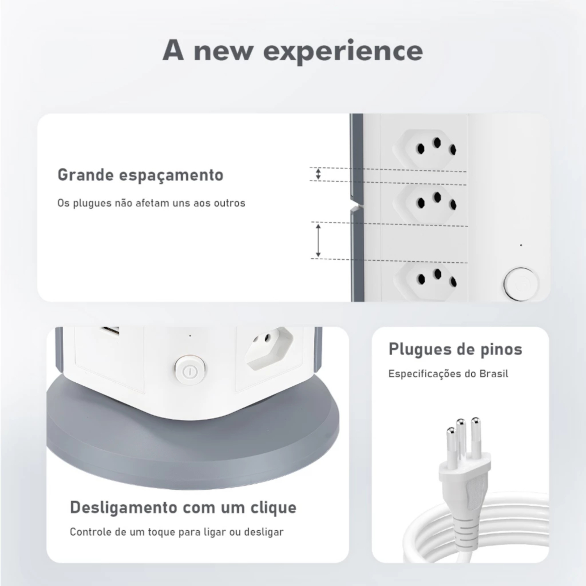 Layout vertical compacto, evita interferência entre plugues e otimiza espaço.